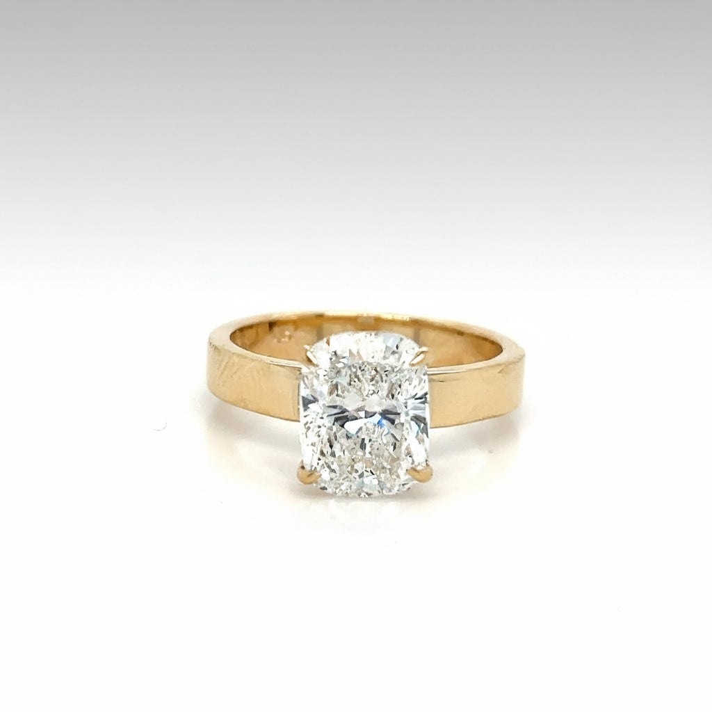 This engagement ring features a 2.5 carat elongated cushion cut lab diamond. It is made custom to order. Lab diamond has become increasingly popular and I will work with you if that is your interest. Set in 14 karat yellow gold. This stone is held with eagle claw prongs. Customization is available. Please let me know if you have any questions. Call us at 757-808-5228.