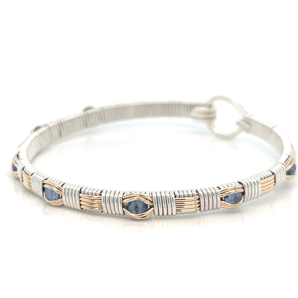 This Classic woven pattern features gorgeous all natural blue sapphires. Woven with the finest Argentium silver 14 karat gold or 14 karat gold filled wires. A truly unique bangle. This bangle collection is customizable. Please let me know if you have any questions. Call us at 757-808-5228. These bangles are made to order.