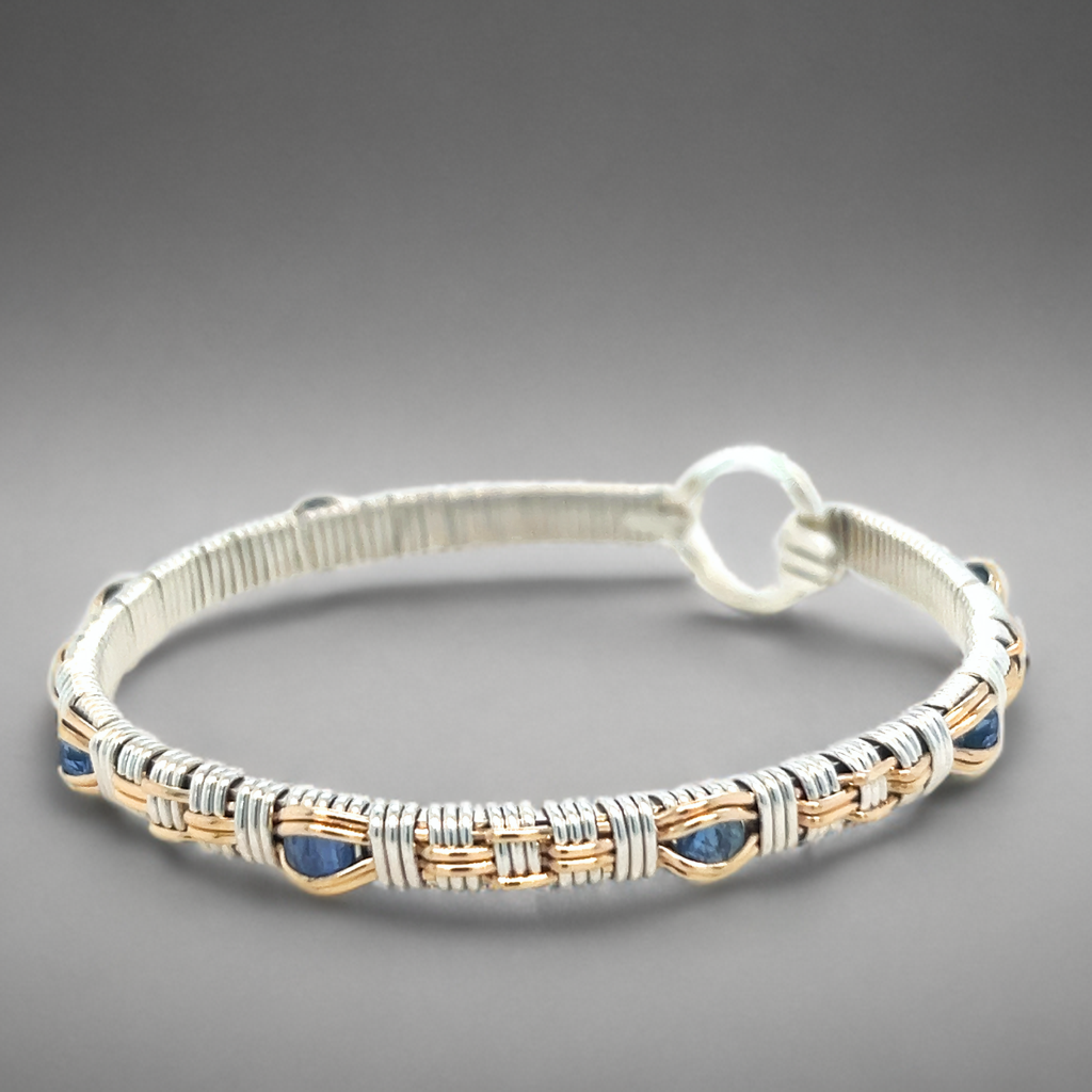 This Williamsburg woven pattern features gorgeous all natural blue sapphires. Woven with the finest Argentium silver 14 karat gold or 14 karat gold filled wires. A truly unique bangle. This bangle collection is customizable. Please let me know if you have any questions. Call us at 757-808-5228. These bangles are made to order.